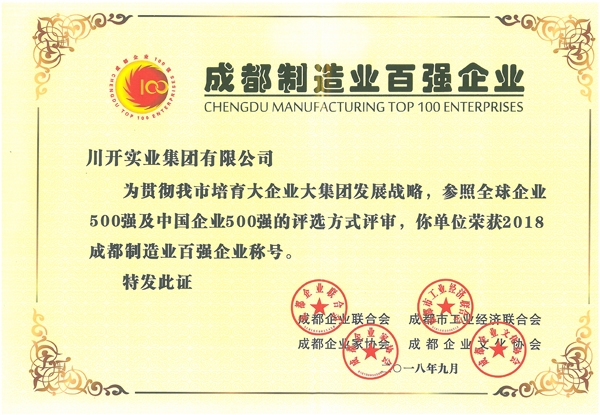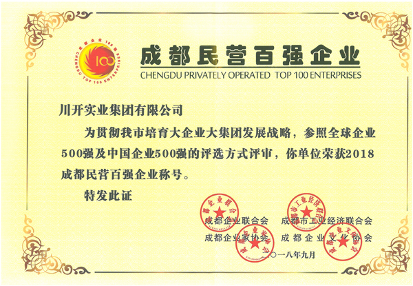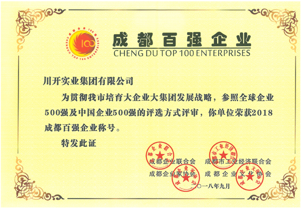川開(kāi)實(shí)業(yè)集團(tuán)有限公司榮獲 “2018年成都百?gòu)?qiáng)企業(yè)” 榮譽(yù)稱號(hào)