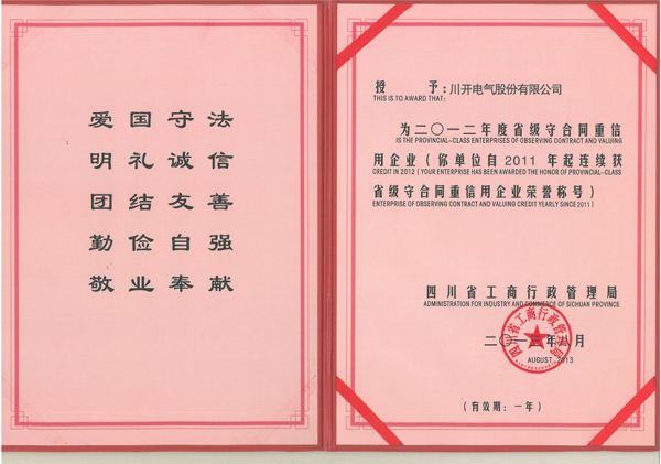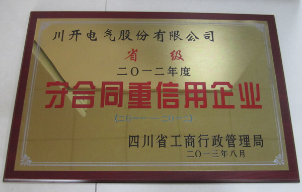 川開電氣榮獲2012年度省級(jí)守合同重信用企業(yè)榮譽(yù)稱號(hào)