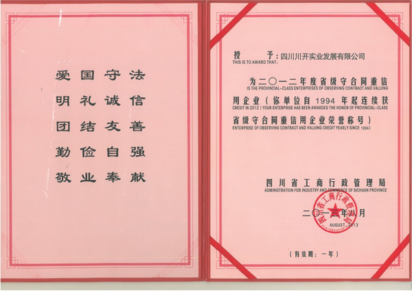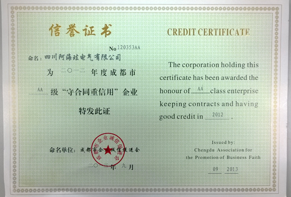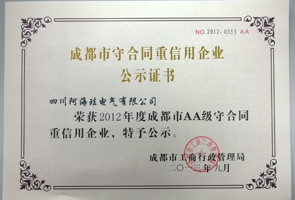 多年來,集團(tuán)公司始終把誠(chéng)信守法作為企業(yè)發(fā)展的重要基石,堅(jiān)持依法經(jīng)營(yíng),通過強(qiáng)化產(chǎn)品質(zhì)量保證、品牌形象,不斷完善售后服務(wù)工作,牢固樹立了以誠(chéng)取信、以信取譽(yù)、以譽(yù)取益的經(jīng)營(yíng)理念,健全完善合同信用管理體系,該項(xiàng)工作得到了客戶群、省、市、縣政府部門的充分認(rèn)可和高度評(píng)價(jià),連年獲得表彰和殊榮。今年8月,集團(tuán)公司、集團(tuán)所屬川開電氣股份有限公司、四川阿?,m電氣有限公司再次被評(píng)為市級(jí)和省級(jí)“重合同守信用”企業(yè)。