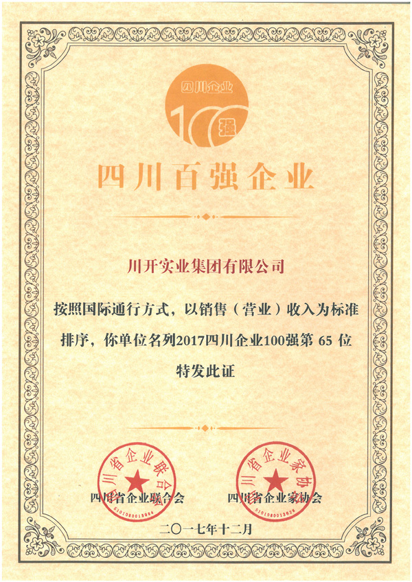 熱烈祝賀川開(kāi)集團(tuán)榮獲2017年四川企業(yè)100強(qiáng)、 2017四川制造企業(yè)100強(qiáng)榮譽(yù)稱號(hào)