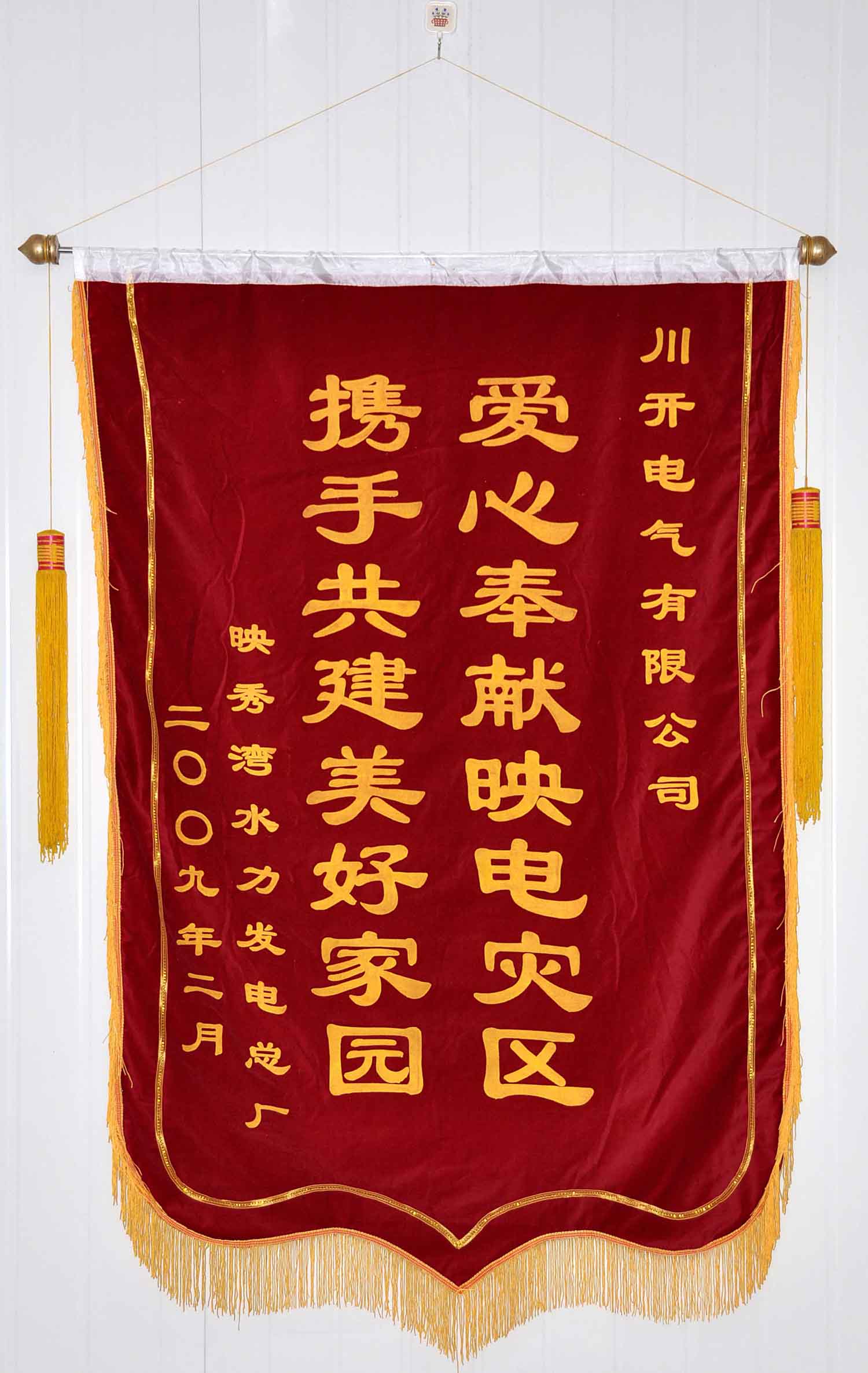 2009年1月19日,公司組織人員前往映秀灣電廠,除了提供技術(shù)服務(wù)支持外,還為映秀灣電廠提供了10萬(wàn)元捐款,以點(diǎn)滴心意援助映秀灣電廠恢復(fù)發(fā)電。此舉得到了映秀灣電廠高度贊揚(yáng),一副“愛(ài)心奉獻(xiàn)映電災(zāi)區(qū) 攜手共建美好家園”的錦旗表達(dá)了映秀灣電廠對(duì)川開(kāi)電氣的深深謝意。