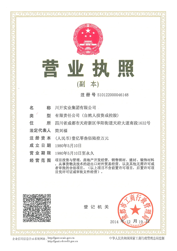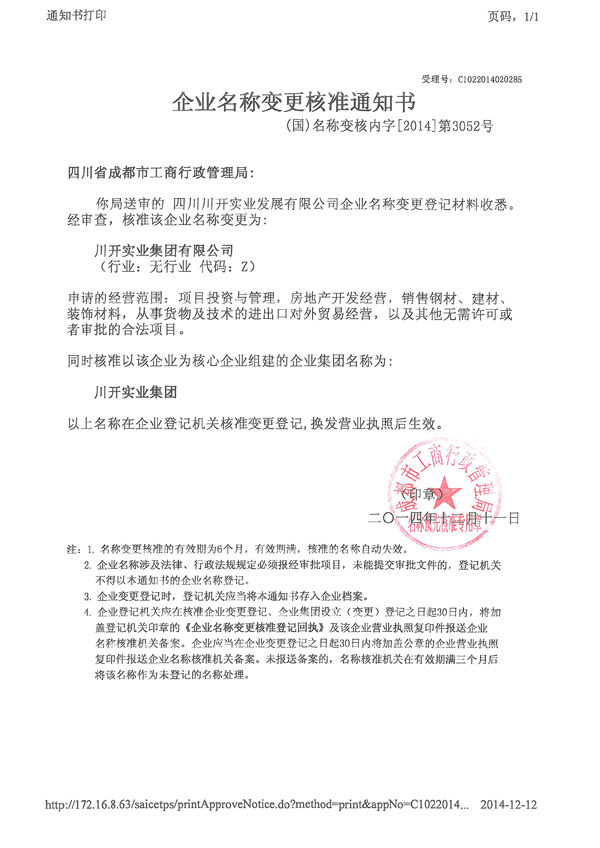 為了更好適應集團運營管理需要,經國家工商行政管理總局核準,成都市工商行政管理局受理批準,“四川川開實業(yè)發(fā)展有限公司”名稱現已變更為“川開實業(yè)集團有限公司”,簡稱“川開實業(yè)集團”。